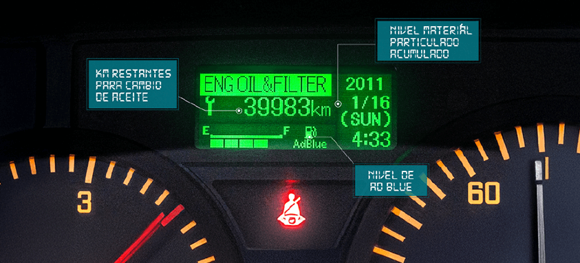 Gracias a esta pantalla de información inteligente (Multi Information Display), el conductor tiene la información necesaria para tomar decisiones en el momento indicado, la pantalla informa el nivel de Urea (adblue), kilometraje regresivo para el cambio de aceite y filtros, la saturación del filtro para regeneración, el cambio de otros fluidos como los de transmisión y dirección hidráulica.
